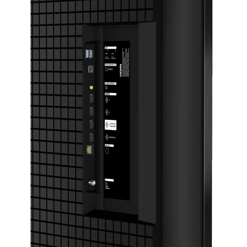 قاب اطراف صفحه نمایش بسیار صاف، صیقلی و باریک طراحی شده که سونی آن را Flush Surface مینامد. این طراحی علاوه بر زیبایی بصری، تمرکز بیننده را روی تصویر افزایش داده و از حواسپرتیهای بصری جلوگیری میکند. ضخامت کلی بدنه تلویزیون ۵.۷ سانتیمتر است که با توجه به استفاده از فناوری Mini LED، ابعادی قابل قبول به شمار میرود، هرچند از باریکترینها نیست. برای نصب تلویزیون روی دیوار نیز میتوان از پایههای دیواری سازگار با مدل XR50 بهره برد که نصب ایمن و منظم را تضمین میکند. سونی توجه ویژهای به دسترسی آسان کاربران نابینا و کمبینا داشته است؛ روی پورتهای خروجی صوتی از جمله پورت HDMI با کانال بازگشتی صدا (HDMI ARC) و همچنین خروجی S-Center Speaker، نقاط برجسته لمسی (Tactile Dots) تعبیه شده است. این نقاط به افراد کمبینا اجازه میدهد فقط با لمس، نوع هر پورت را به آسانی تشخیص دهند که خصوصاً در زمان نصب تلویزیون روی دیوار و اتصال به ساندبار یا سیستم سینمای خانگی، بسیار کاربردی و موثر است.